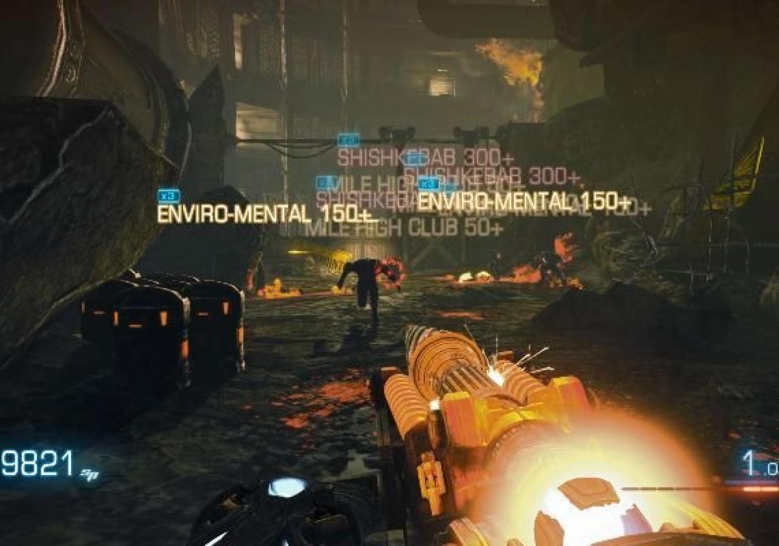 "Skillshot" is one of the game's unique features. It which rewards the player for killing opponents in the most creative and destructive ways possible. Points are rewarded by various actions, such as killing enemies in midair, making use of environmental hazards or utilizing a weapon's distinct feature. The more complicated or unusual the skillshot, the more points players acquire. Points are used as currency at "dropkits" scattered across the planet to purchase firearms, ammunition and upgrades. The dropkits include a shop, a skillshot checklist, and gameplay statistics.