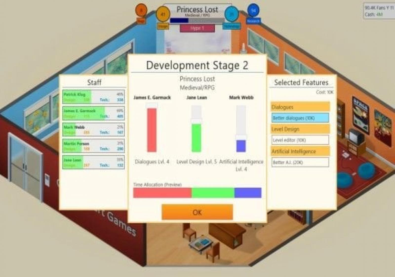 • Grow your company - Once you have successfully released a few games you can move into your own office and forge a world-class development team. Hire staff, train them and unlock new options.